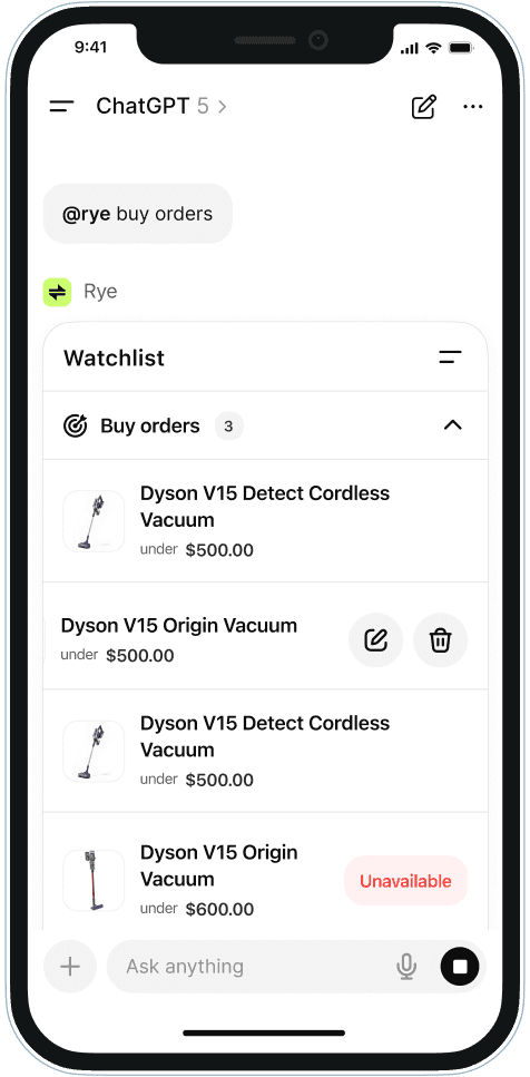 Set target price thresholds; Rye automatically executes the purchase when cost inclusive of shipping drops to your limit.