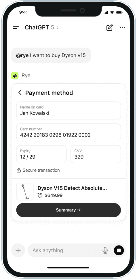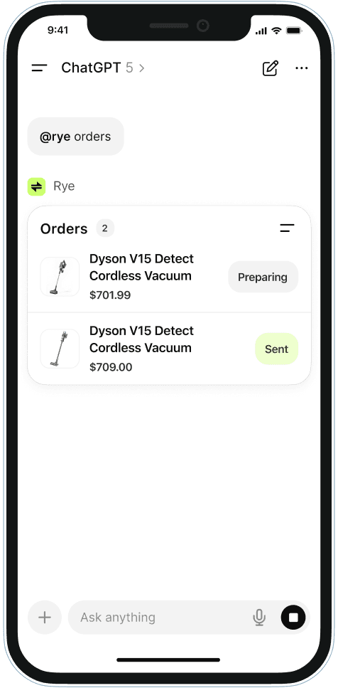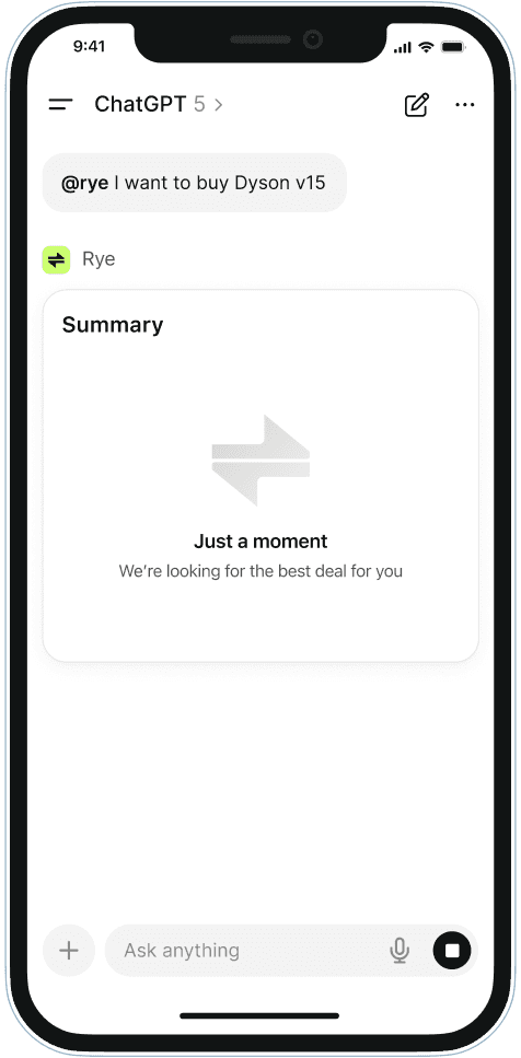 Complete purchases without leaving the conversation. Payment, shipping, and tax handled through Rye's secure infrastructure.