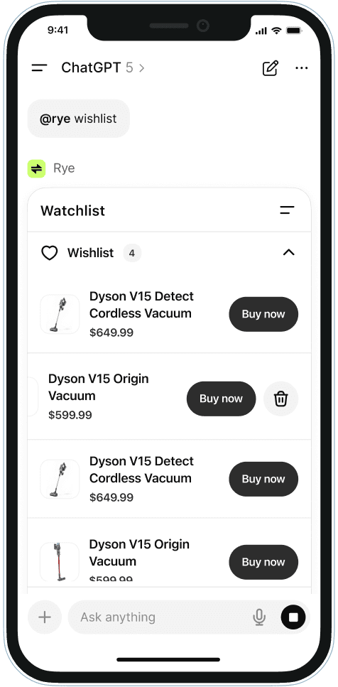 Save products to your unified wishlist; access anytime via @Rye wishlist for quick retrieval.