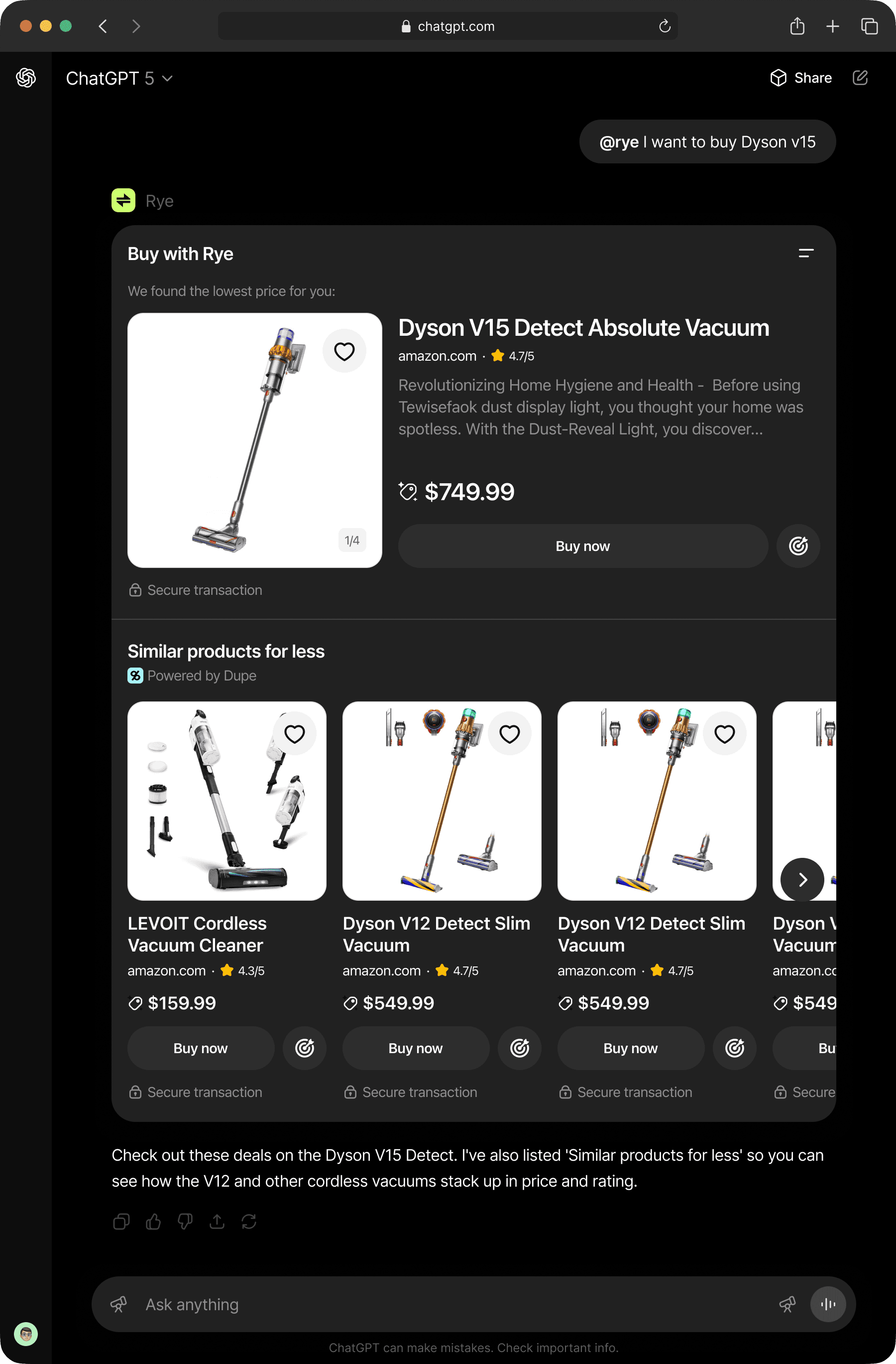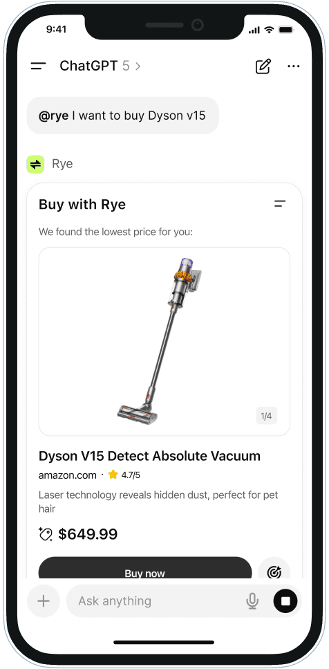 Rye for ChatGPT leverages the Model Context Protocol (MCP) to bridge the gap between AI reasoning and physical commerce. It's not just a search tool—it's a full-stack checkout engine that lives inside your chat.