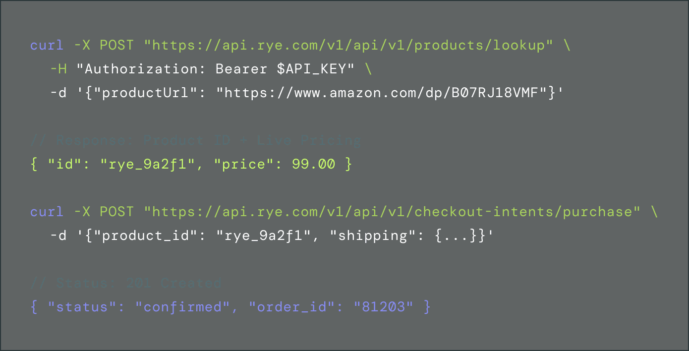 Two API calls. Any product on the internet. From discovery to confirmed order.